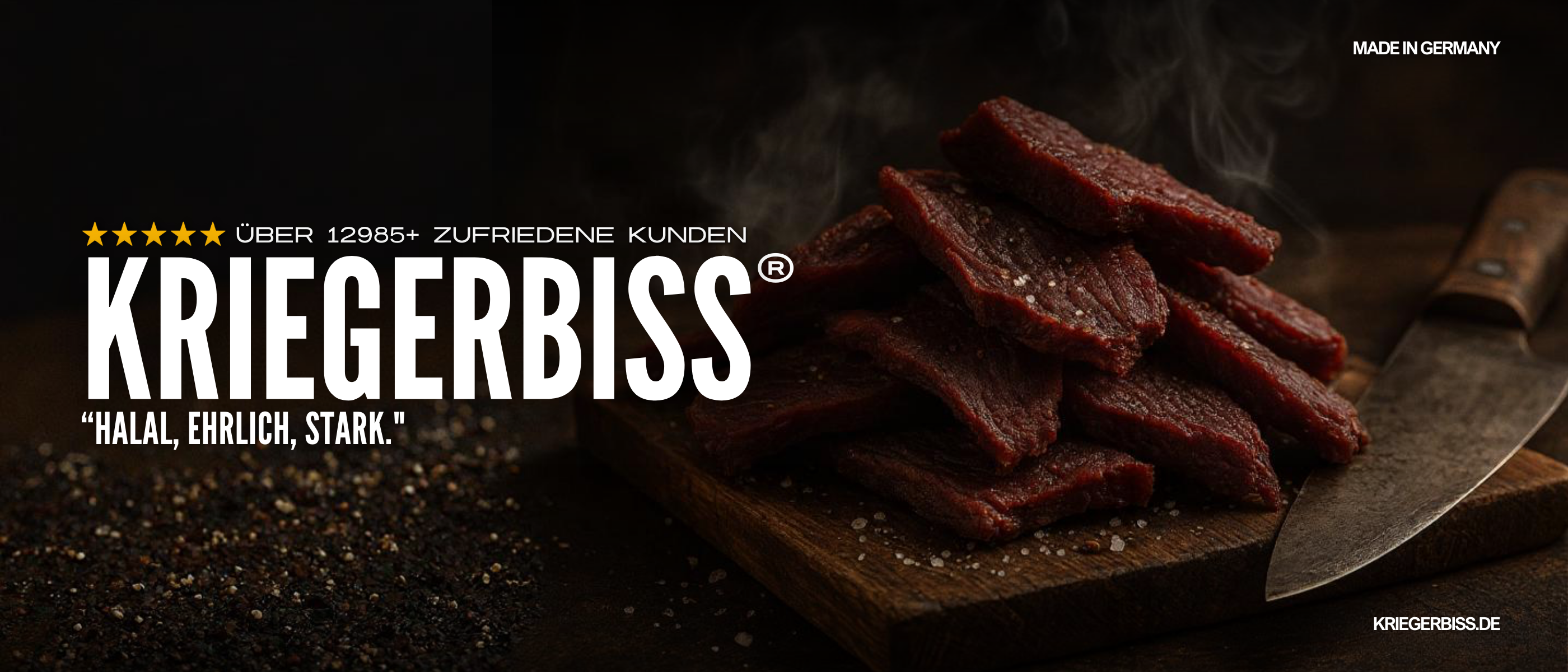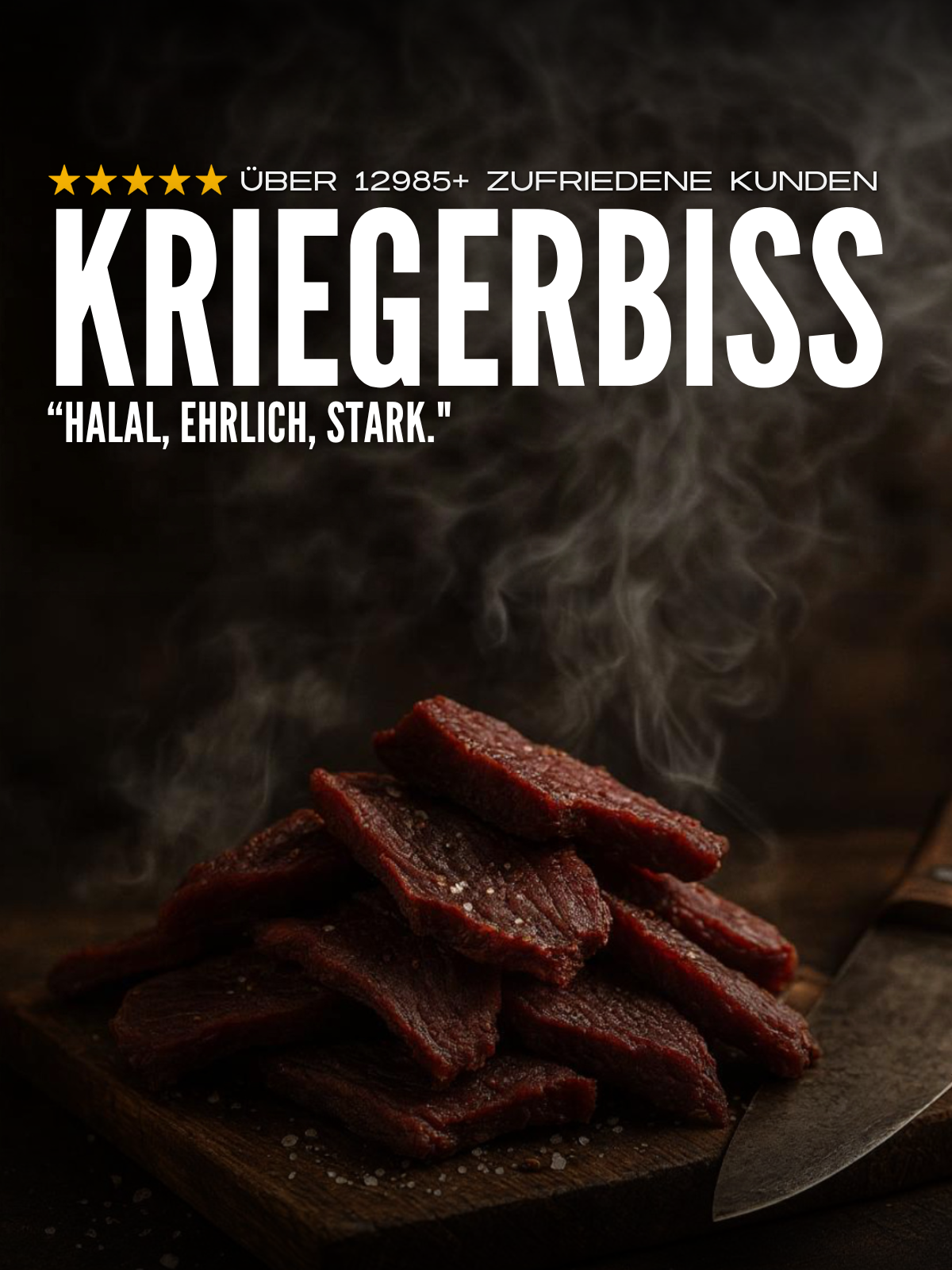 Kriegerbiss®liefert dir 100 % Halal-Rindfleisch, handgewürzt und proteinreich – ganz ohne Zucker und unnötige Zusätze.